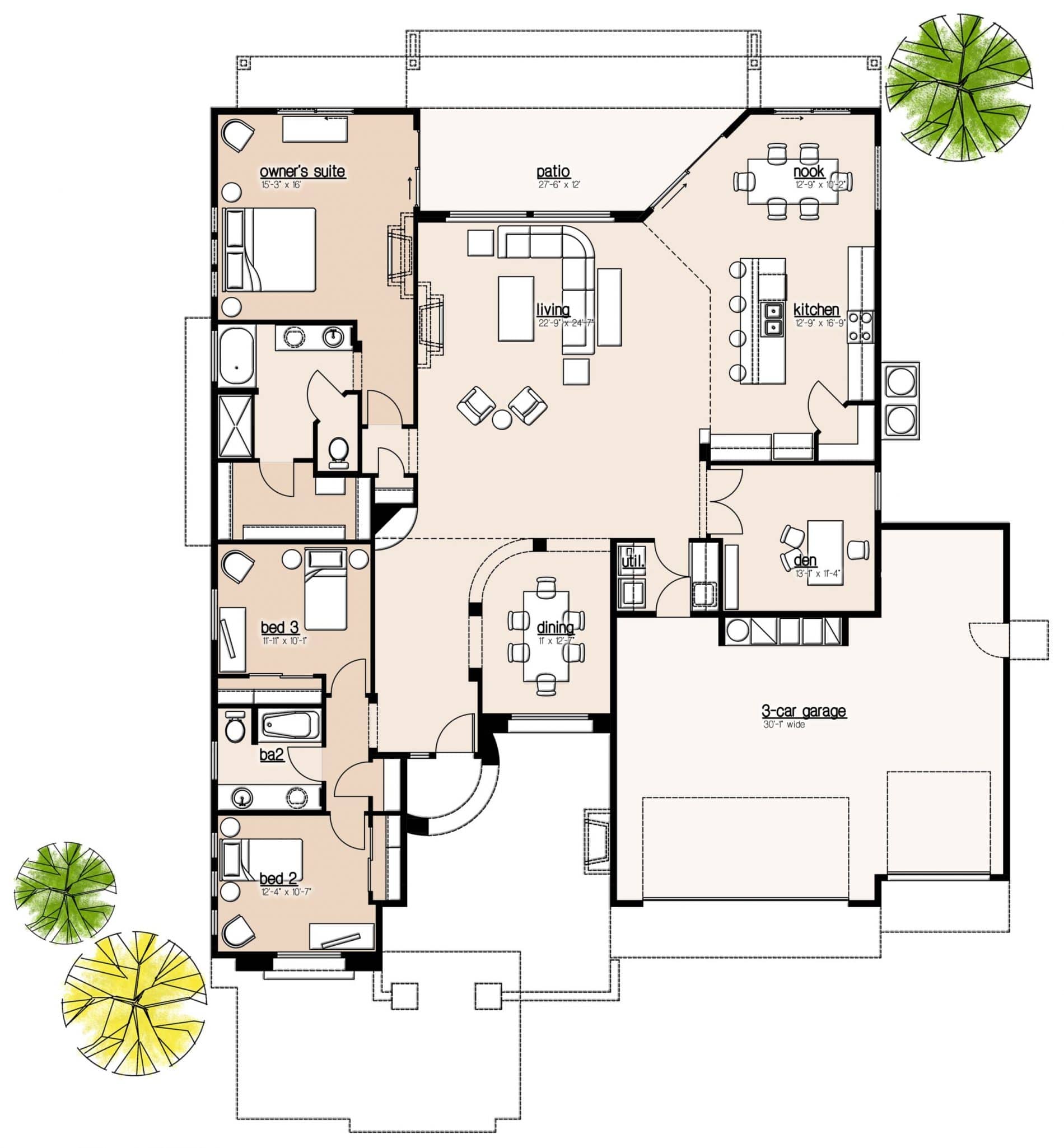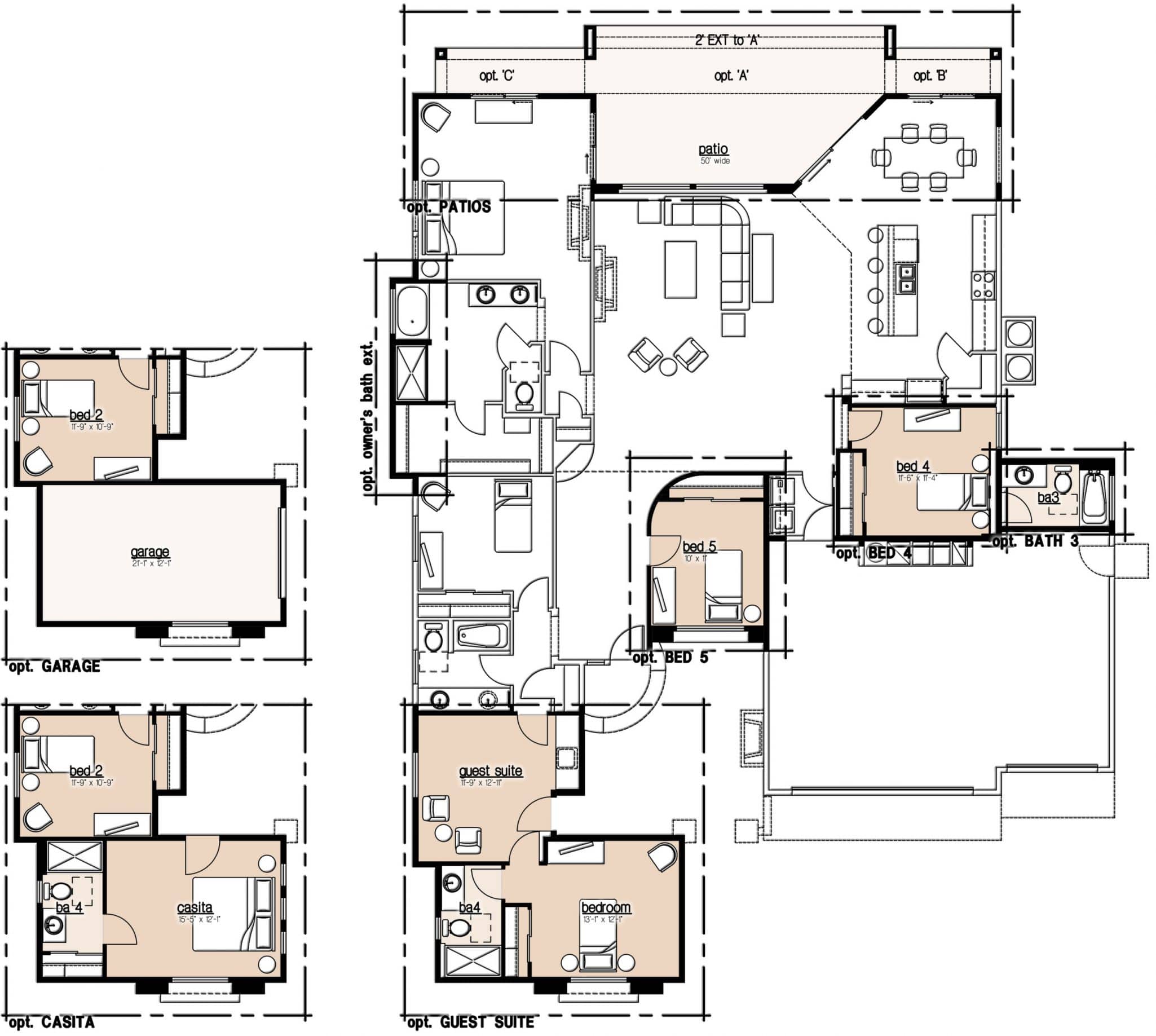 Single Story, 3+ Bedrooms, 2+ Baths, 3 Car Garage, Family Room, Nook, Den, Dining Room, Optional 4th Car Garage, Optional Luxury Master Bath, Optional 3rd Bathroom, Optional 4th Bedroom ILO Den, Optional 5th Bedroom ILO Dining, Optional Casita w/Full Bath 2,439 Square Feet