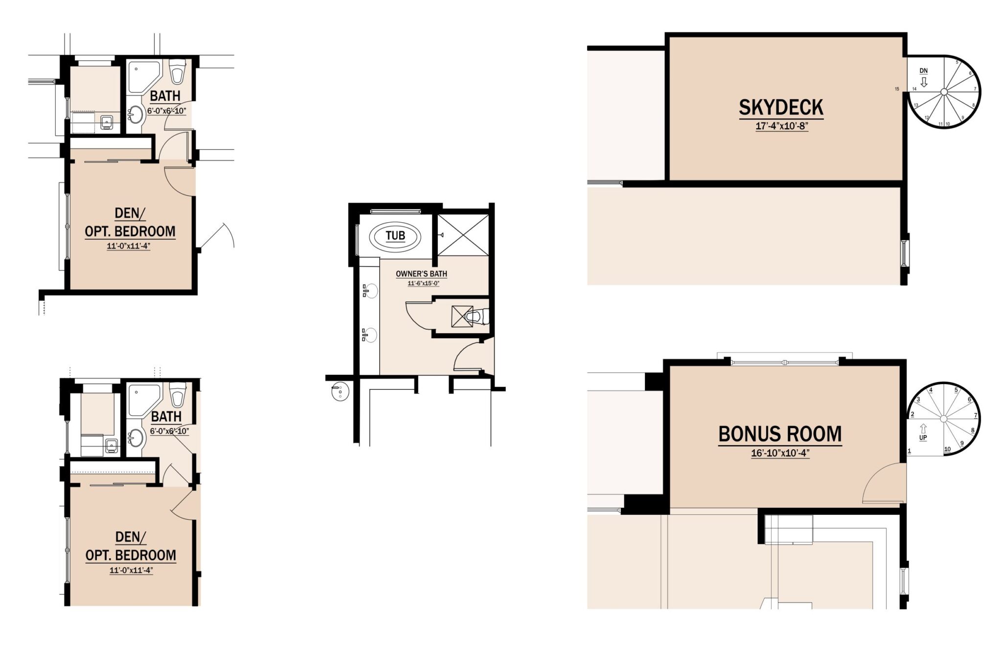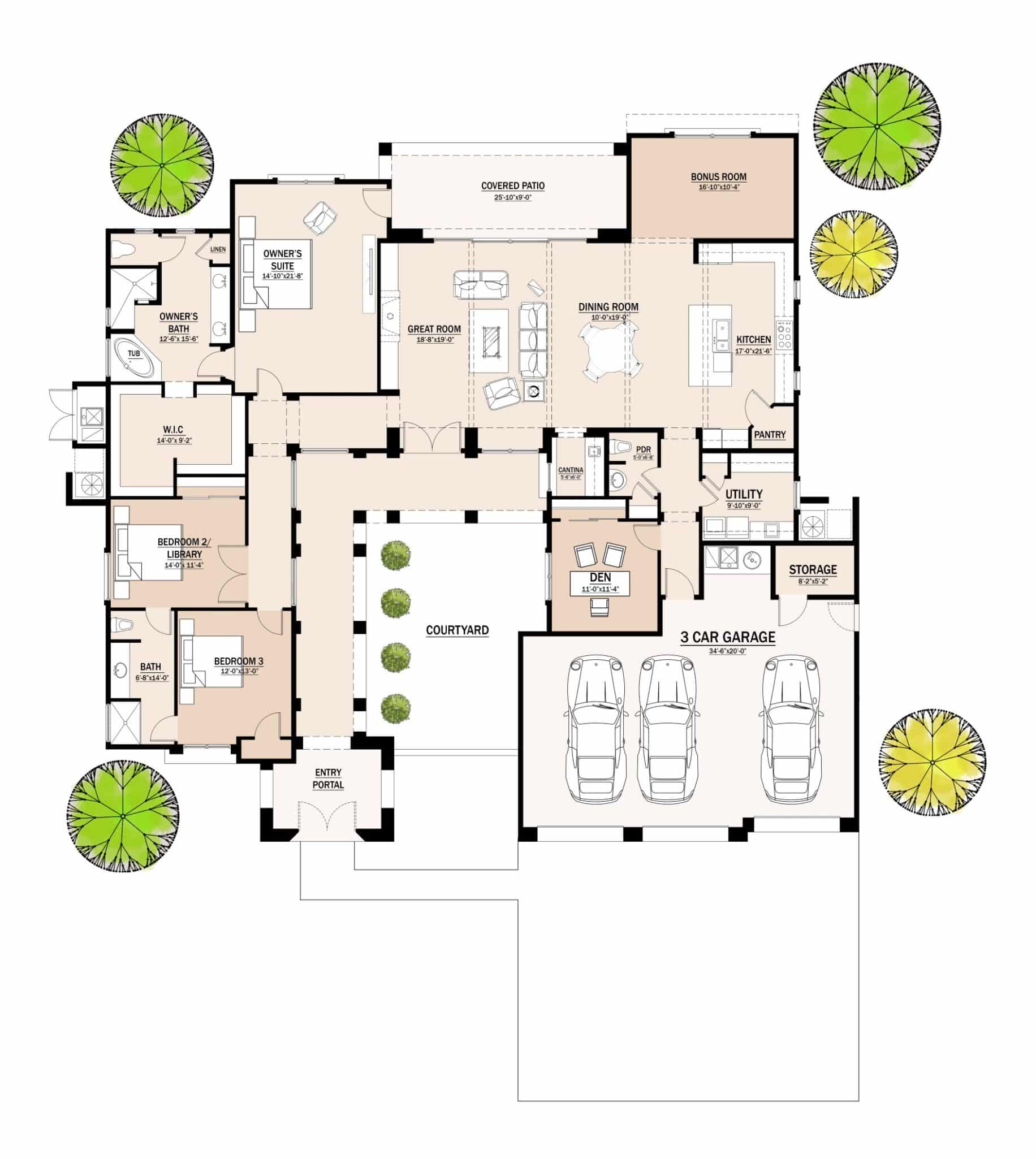 Single Story, 3+ Bedrooms, 2 ½+ Baths, 3 Car Front-Load Garage, Great Room w/16’ Ceilings, Bonus Room, Dining Room, Den, Entry Portal to Interior Courtyard, Optional Sky Deck, Optional 4th Bedroom w/Full Bath, Optional 6’x10′ Rough Sawn Beams in Great Room, Dining Room & Kitchen
