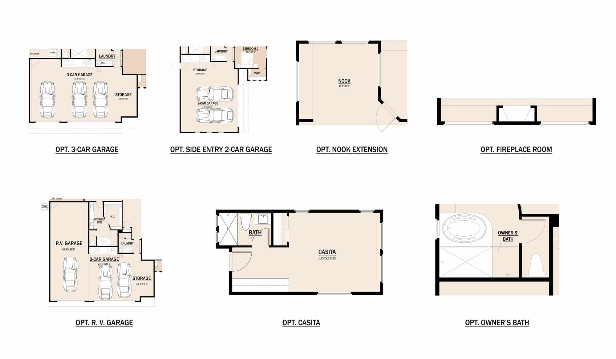 Single Story, 3+ Bedrooms, 2 ½+ Baths, 3 Car Front-Load Garage, Great Room, Owner’s Suite w/Sitting Area, Optional RV Garage, Optional Nook Extension, Optional Detached Casita w/Full Bath